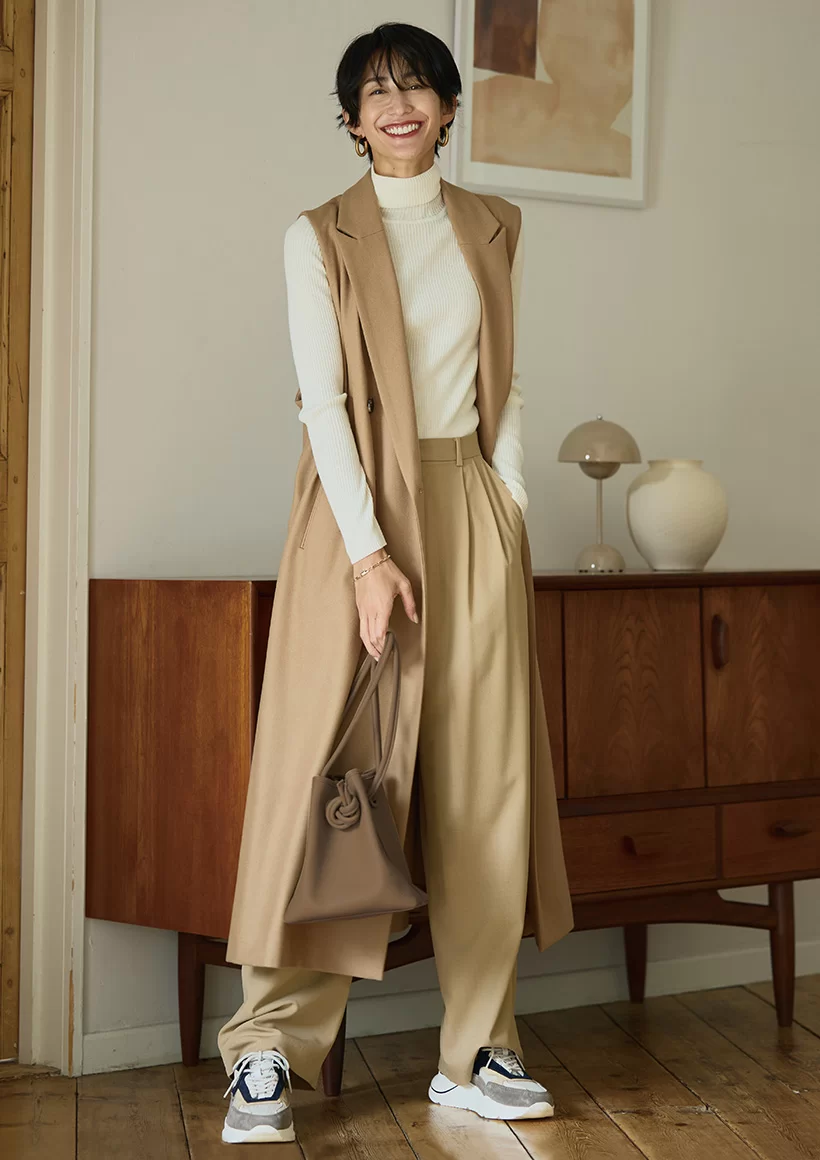 たっぷりと長めの着丈で、今季流行中のショートパンツとも相性抜群。ボーイッシュなアイテムを組み合わせた硬派なスタイルにも、ニットベストを重ねることで季節感と優しさをプラスできます。