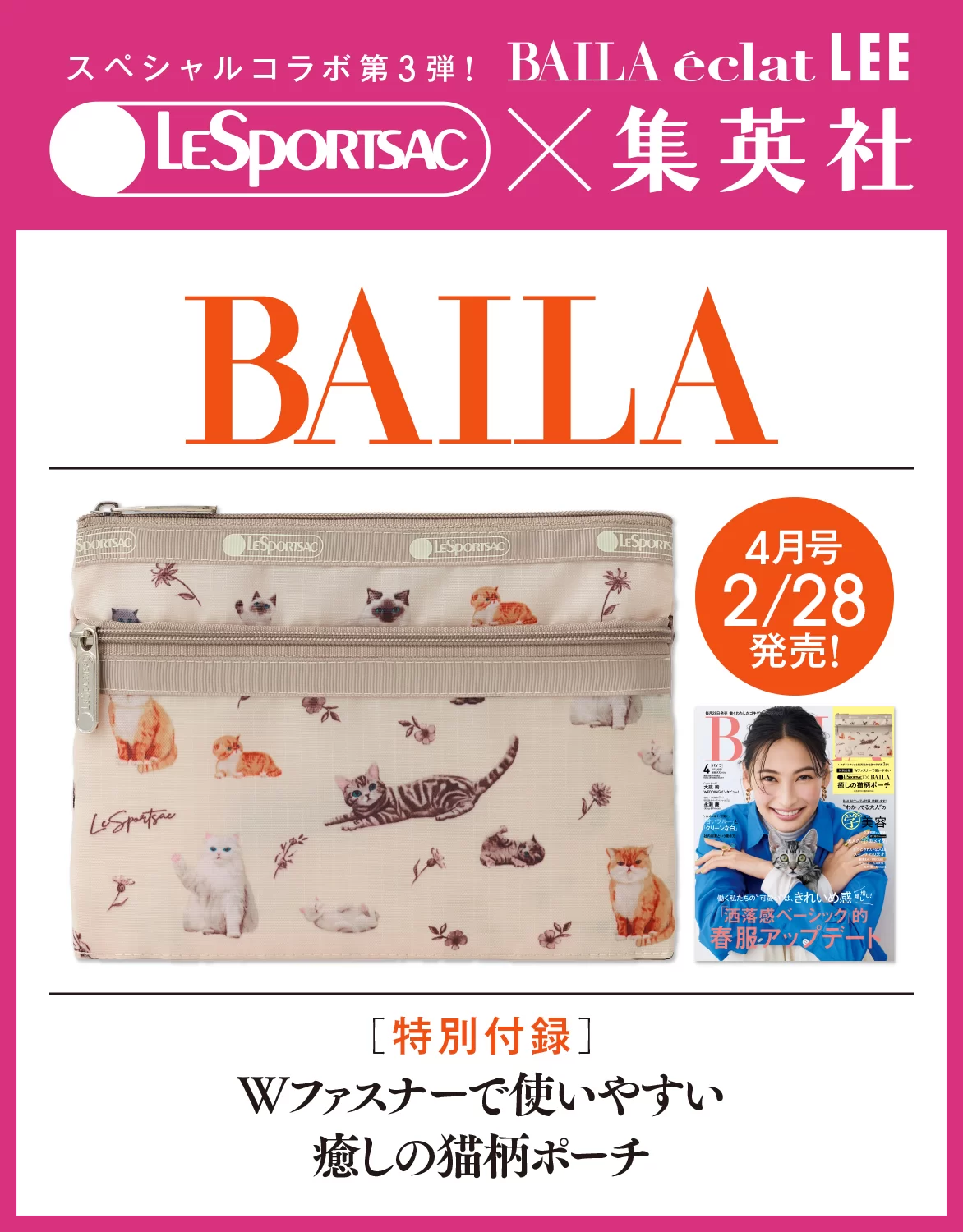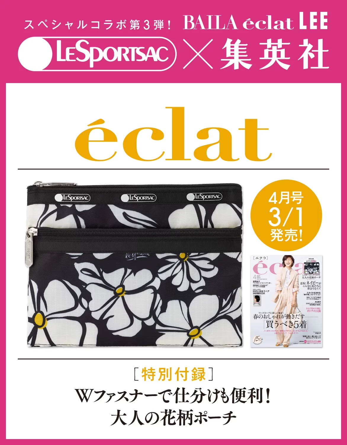 伝説の付録が再び登場!世界中の女性から支持されている「レスポートサック」と、集英社ファッション誌3誌のスペシャルコラボ。「BAILA」「éclat」「LEE」の3誌にここでしか買えない、レスポートサックの限定ポーチが付録で登場!今回はWファスナーになって、さらに使いやすさもパワーアップ!