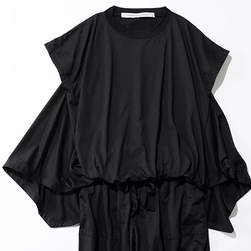 上身頃はコンパクトなAラインのTシャツライクな形。ゆとりあるシルエットでやせ見えします。