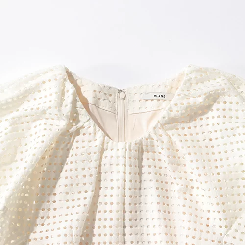 カットワークとニュアンスのあるホワイトがフェミニンなワンピース。「このCLANEのワンピースは、ドットメッシュでモード感たっぷり。パフ袖やシルエットがどこかドレスっぽいので、コーデする小物はあえてカジュアルダウンするものを選びます。ビーサンやGジャン、リユーサブルバッグをドレスに合わせることで生まれる、こなれ洒落感が今な気分です」(石関さん)
