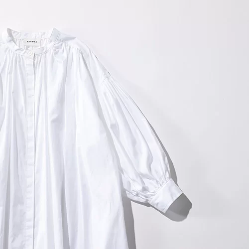 厳選されたオーガニックな綿を使用したオックスフォード生地を贅沢に使用。肌触りがよく、サイドポケット付き機能性もGOOD。スタンドカラーできちんと感がありつつ、たっぷりした見ごろでリラックス感も十分。