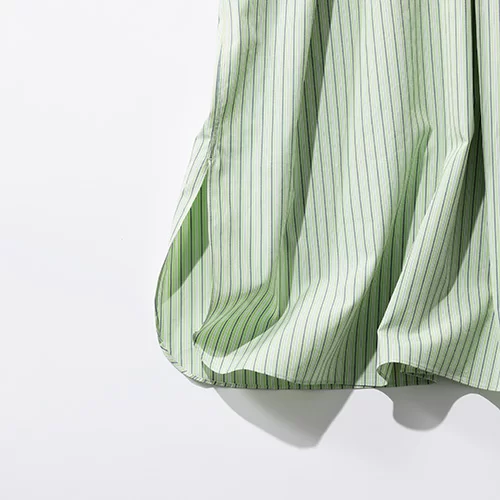 ハリのあるコットン生地で仕上げた、シャツライクなワンピース。LENOならではのこだわりシルエットは、すっきりしていながら落ち感がエレガント。バンドカラーとシックなストライプが上級なニュアンスを与えてくれます。裾のサイドスリットの抜け感も◎。