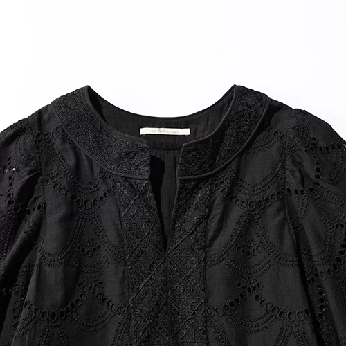ベースと同色の刺繍を全面に贅沢に施したワンピースは、大人の女性こそ似合う逸品。「ヘムラ刺しゅうが美しいne Quittez pasのブラックワンピは、程よい甘さで大人向け。かごバッグでもレザーを施したきれいめなアイテムやビジューがついたサンダルなどで、華やかさを盛ると洒落ムードが上昇します」(石関さん)