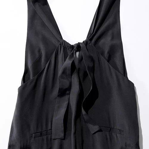 シルキーな光沢となめらかな肌触りが特徴の、上質なレーヨン・シルク素材を使用。裾に向かって広がるシルエットが大人な印象で、深くカットしたVネックラインが上品さを格上げ。バックスタイルの結びデザインもキャッチーなポイントです。