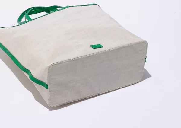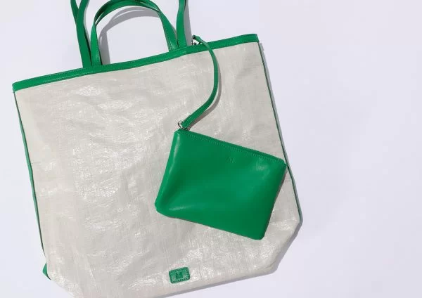 シャカシャカしたポリプロピレン素材で水濡れを気にせず使用可能。持ち手とトリムのカラフルなヴィーガンレザーがポイントで、ごくごく軽くて大容量。バッグ内で小物が整理できるよう、小さなポーチが付いているのも◎。持ち手が長いので、肩掛けすることも。