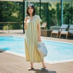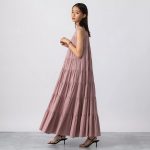「ランダムなドット柄がちりばめられ、黒でも華やかさのある夏のイチ押しです。さらっとした着心地で清涼感のある素材なので、真夏も涼しい。腰高位置に切り替えを入れることで脚長に見え、フレンチ丈のドルマンスリーブが二の腕や肩周りをふんわりカモフラージュ。洗練されたデザインながら、大人の体型カバーを意識した作りになっています」(MD Koz)