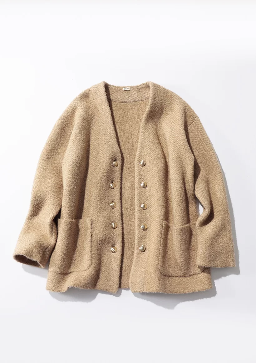 ふっくらとした素材感が可愛いダブルジャガード仕立てのニットコート。両サイドにあしらったボタンは、右のみつづみボタンになっていて、外せばシングルジャケット風にもなるアレンジがユニークなデザインです。