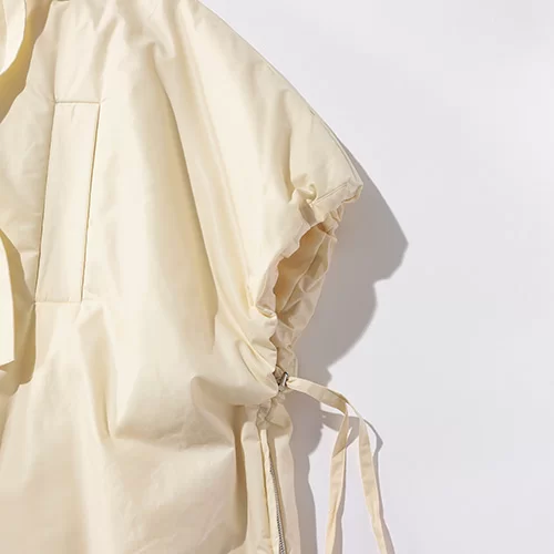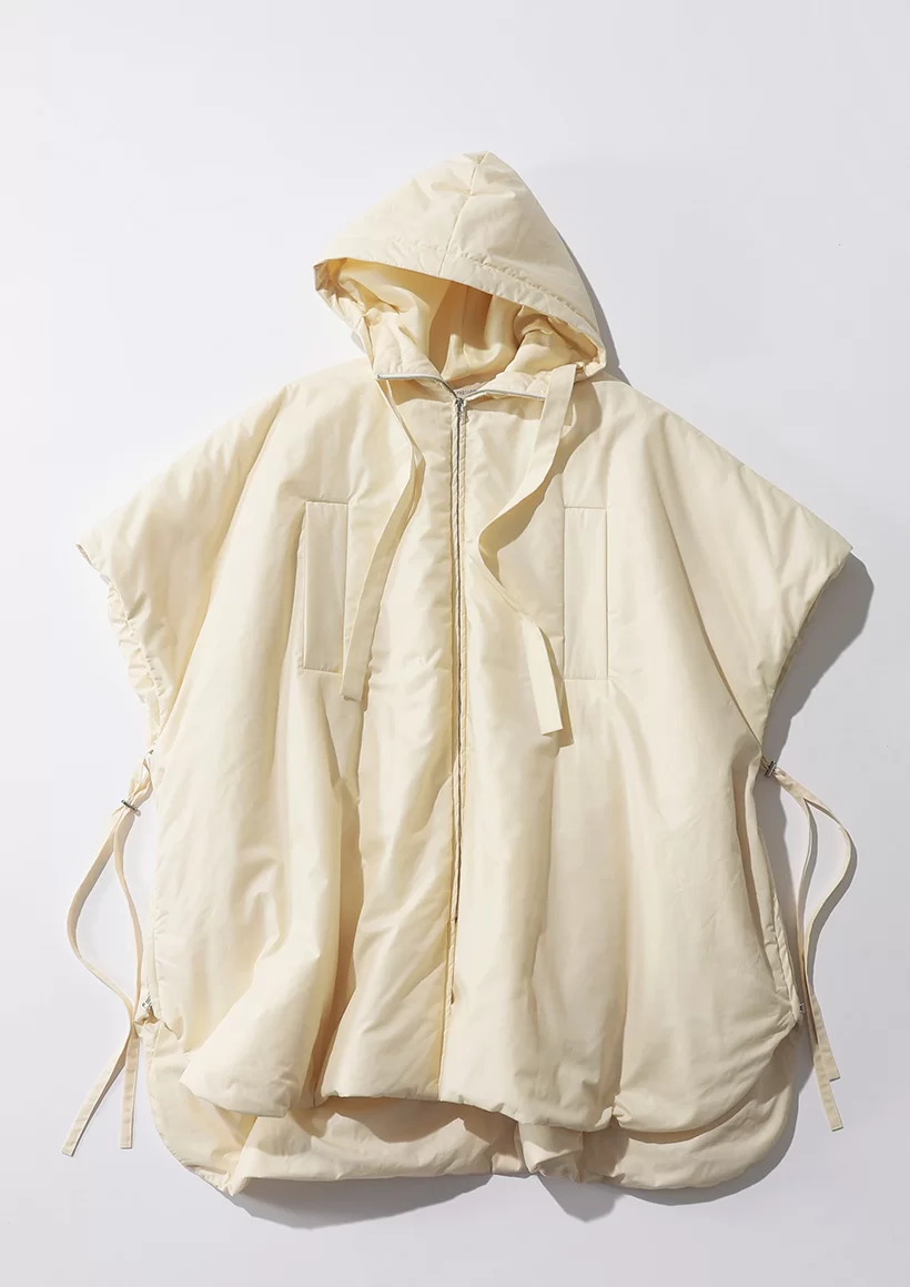 Aラインが華やかな中綿入りのコート。ハーフスリーブ、ファスナー式のサイドのスリット、フードにあしらった共布のリボンなど、特徴のあるディテールが着るだけでサマになるとっても軽いヘビロテ必至の一着です。
