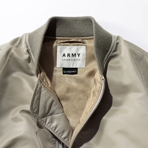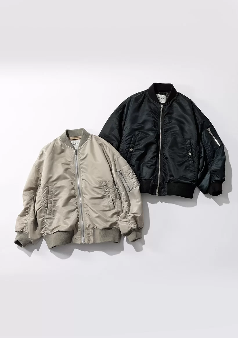 昨年も追加生産したふんわりボリュームのある袖や、抑えめの艶感で淡いセージカラーと、どことなく女らしさが香る大人のためのMA-1。同じく定番の「THE U-1」より着丈を短くしているので、より扱いやすく、着るだけで絵になる一着です。