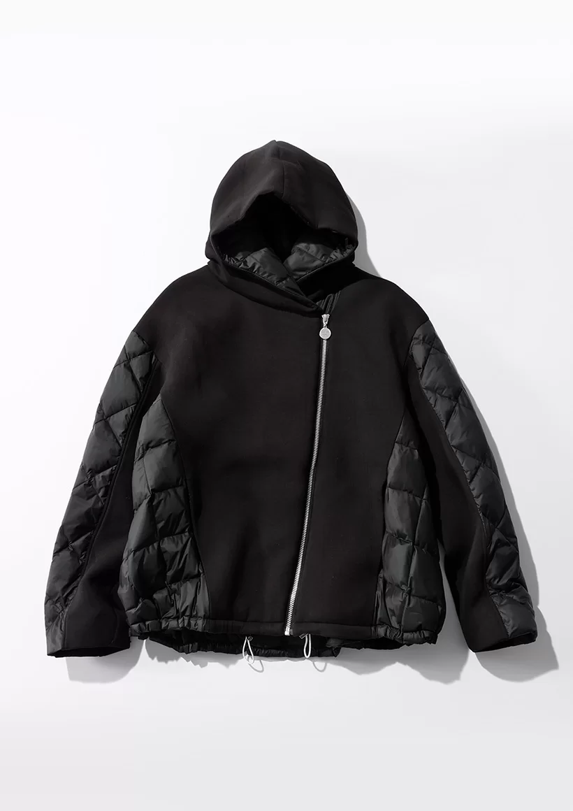 ダンボールニット×ナイロンのコンビだから、カジュアルすぎず、エレガント派にも支持されるライダース風のダウンブルゾン。裾のコードを絞ると、イマっぽい丸みのあるシルエットにもアレンジできるところも◎。お値段より高く見えるのもずっと売れている理由です。