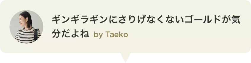 オールホワイトのコーディネートにゴールドバッグをなじませて。カーキがかった控えめなメタリックの光沢感だから、悪目立ちせず、どんな色の着こなしにも上品な華やかさをプラスしてくれる。