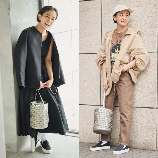 控えめメタリックの小物って華やかなのに合わせる色を選ばず持っていると助かるアイテム。メッシュのバケツ型もかごバッグみたいで、でもそこまでカジュアルじゃないから通勤にも。必要なものがちゃんと入るジャストな大きさにしました。