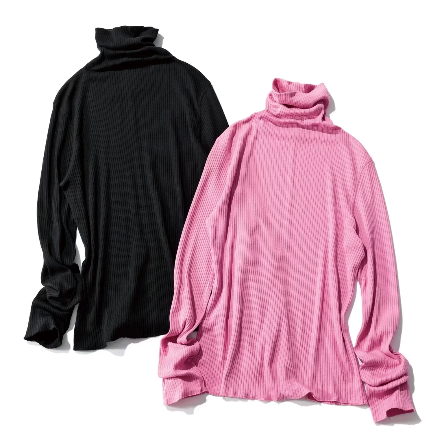 襟や袖口がくしゅっとなるインナータートルが大好き。これは透け感のある薄手素材だからフィットしても心地よく、ニットの襟ぐりや袖口からのぞかせてもおしゃれ。黒&白はもちろん、派手色も活躍しそう!