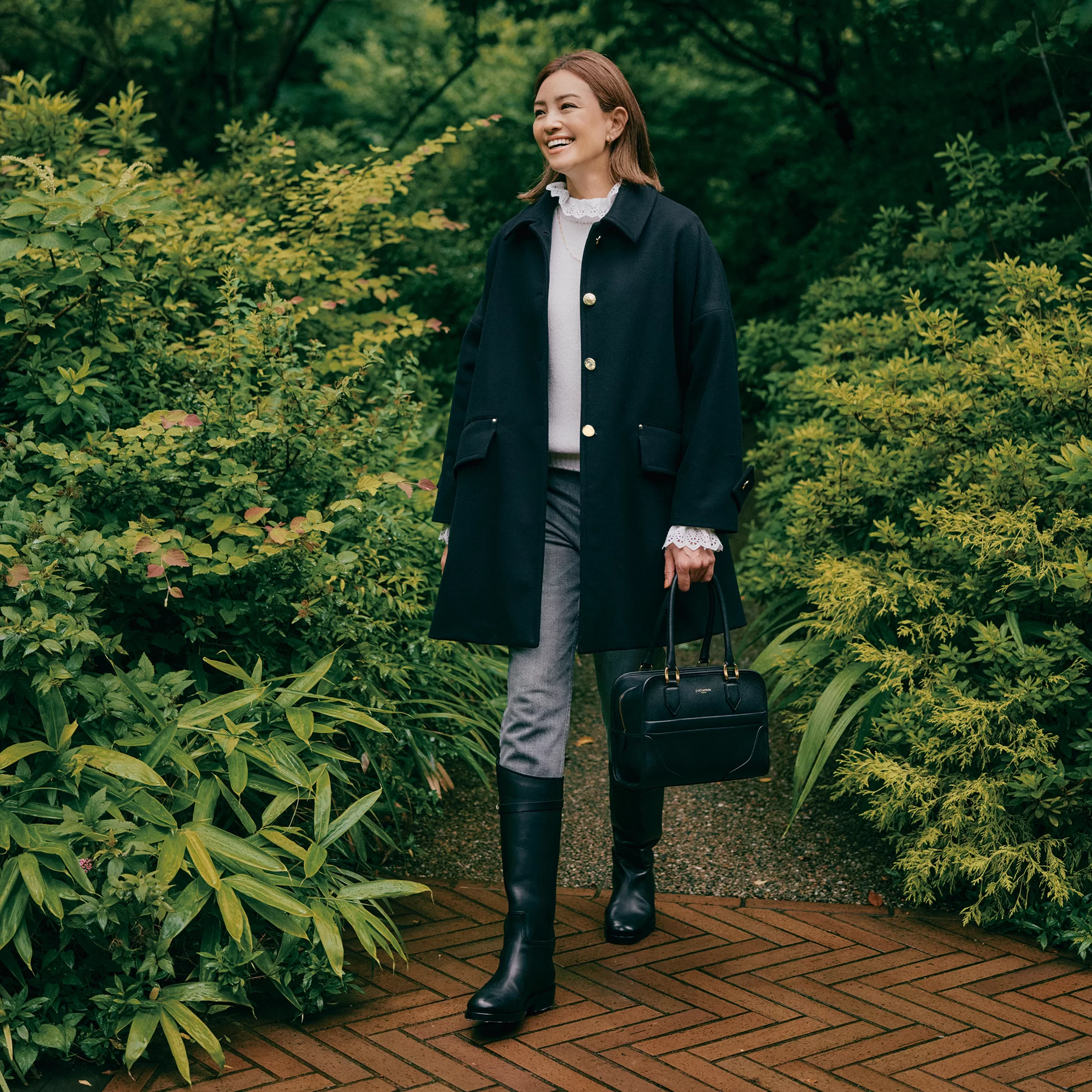 飽きのこないフォルムとボトムを選ばない着丈で、毎シーズン完売が続くAラインコート『ハンビー』。今年は、ゴールドボタン使いのデザインをセレクト。クラシックな品のよさに華やかなニュアンスが加わって、高感度な印象がアップ。