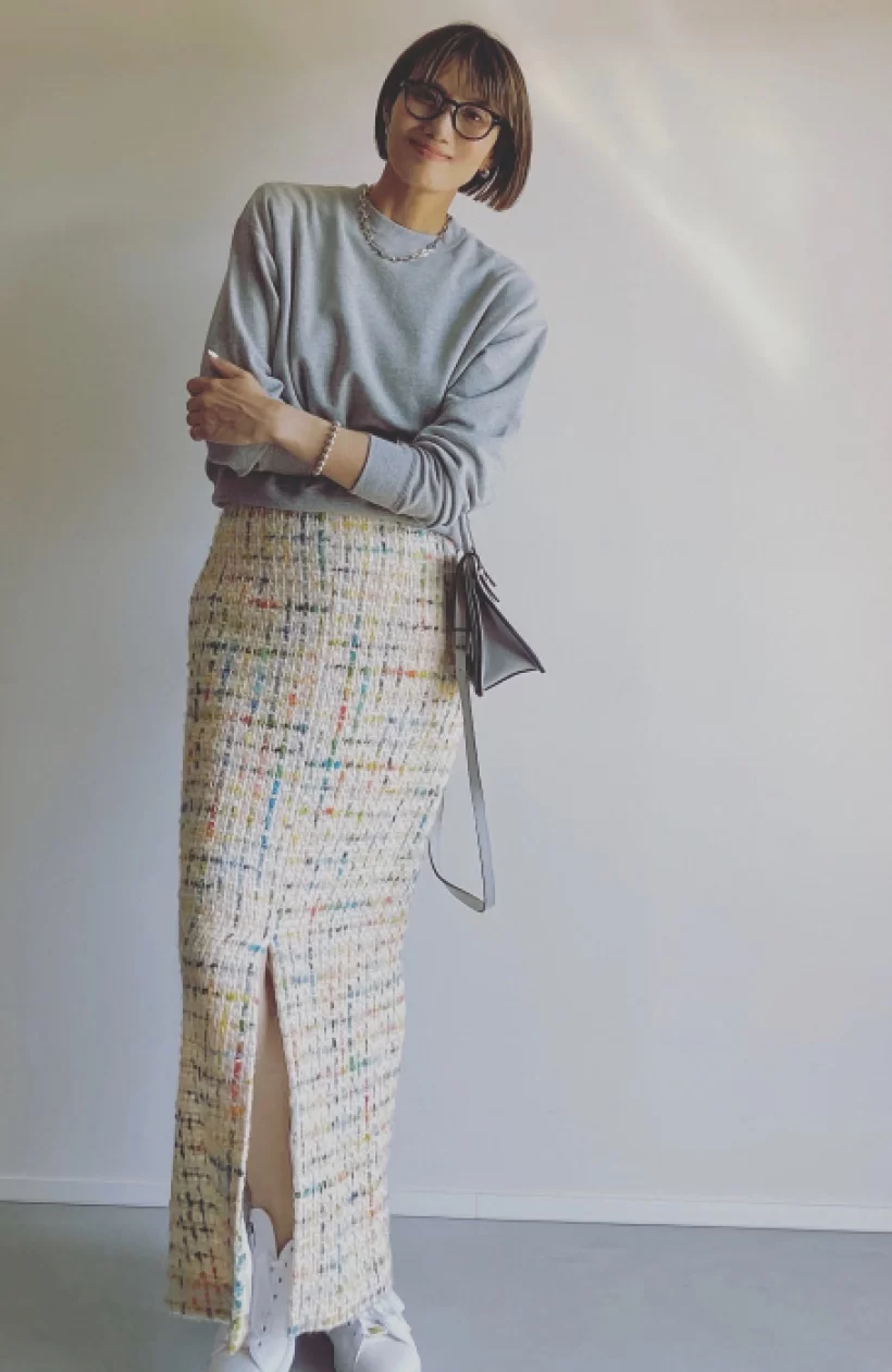 杢グレーのスウェットはマキシ丈のミックスツイードスカートと合わせて明るい印象に。トップスがコンパクトなのでスニーカーでも脚長に。