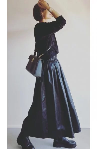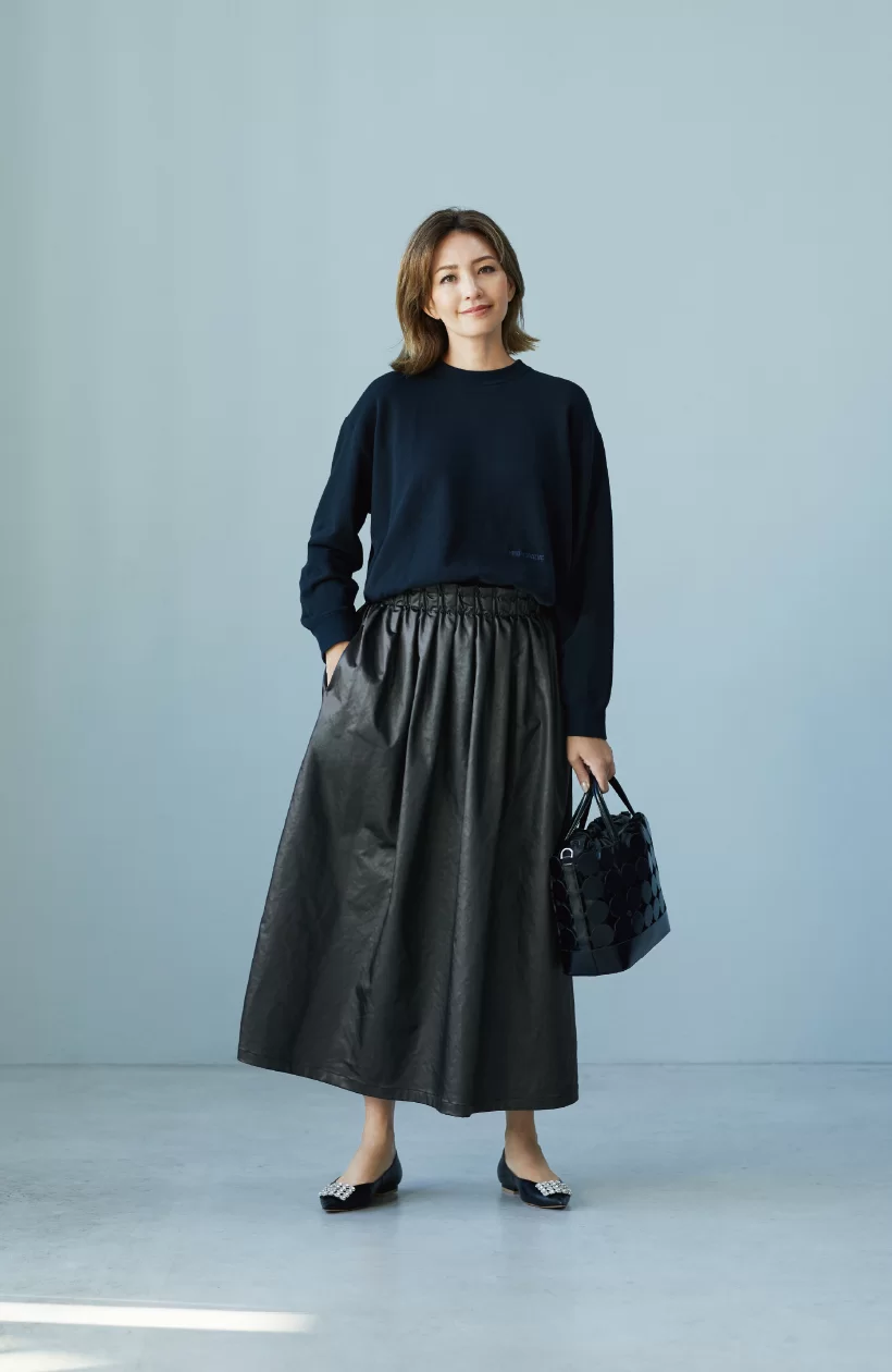 「レザーアイテムが大好きですが、物によってはハードすぎたり、重く見えてしまうことも。そこで長さがたっぷりありながらモード感が強すぎず、しゃれた雰囲気で着こなせるスカートをコラボ。ロング丈ながらエコレザーなので見た目に反して軽く、自宅洗いまでできる最高の一枚に仕上がりました!」(坪田さん)