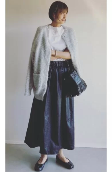 旬なラメカーディガンとも好相性なエコレザースカート。着心地が楽なウエストゴムスカートにもかかわらず、レザーの質感により高見え確実