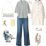 カジュアルでシンプルなブルゾンなので、デニム合わせの時はしゃれ感のあるトップスがマスト。今回はブラウスのフリル襟を効かせつつ、インナー上下をブルーのワントーンで揃えて洗練されたムードに。ナイロンブルゾンに甘めのブラウスの組み合わせは簡単に着映えるのでおすすめです。