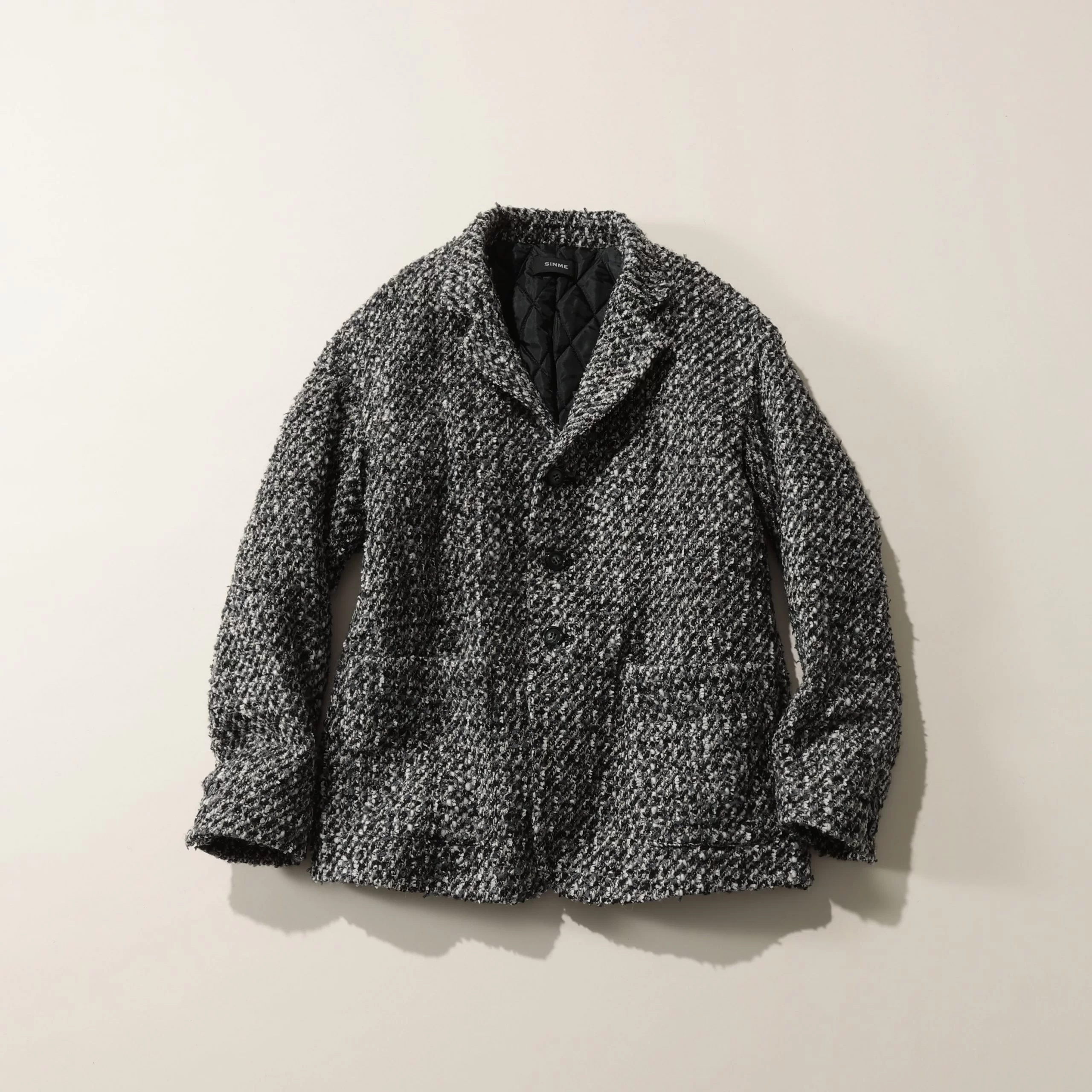 メンズライクなルックスで人気の「SINME」の定番ジャケットを、華やか見えするモノトーンのツイード素材で別注。大きすぎずコンパクトすぎないほどよいサイズ感のジャケットは、小さめのスタンドカラーがシャープな印象。中綿が入っているので、冬でもこれ一枚で過ごせるほど暖かい!
