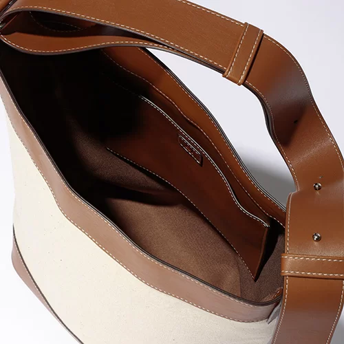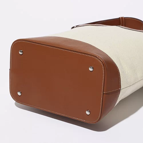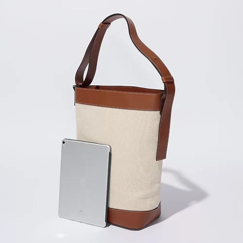 ブランド人気No.1のバケツ型バッグに新モデルが登場!春夏らしいキャンバス素材とヴィーガンレザーのコンビが軽やかな印象の大容量バッグはマチが広く、PCもすっぽり入ります。ヴィーガンレザーといえど本革のような質感と上品なキャメルカラーで、大人のスタイリングをリッチに見せてくれます。