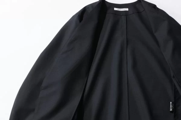 軽やかな着心地とオーバーサイズデザインが普段使いしやすいノーカラージャケット。リラックス感がありながら、作りは本格派。日本有数のテーラード・ファクトリーでセミハンドメイドで仕立てられ、素材はハピプラストア別注のしなやかなウール生地を使用。“カッタウェイ”と呼ばれるクラシックな裾の形状を採用するなど、正統派なディティールはまさに本物志向の大人向けジャケットです。