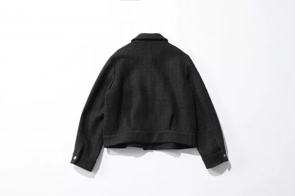 ふわふわと飛び出したフリンジがパッと目を惹くツイードジャケットは、日本に数台しかない機械で編み上げたオリジナルのファンシーモールが魅力。身頃と同色で縁をトリミングしたノーカラーデザインで、デニムやミリタリーパンツなどカジュアルボトムに合わせても上品にまとまります。