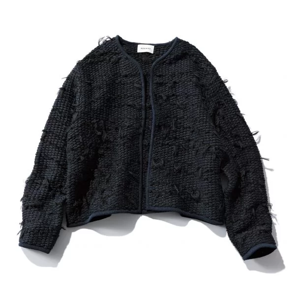 こだわり素材に旬を取り入れた女性らしいデザインが得意な「アダワス」。新作のツイードジャケットはショート丈のノーボタンでさっと羽織れる軽やかな着心地。ハピプラストア別注色はネイビー地にブラックのフリンジが編み込まれたシック&エレガントな一品!