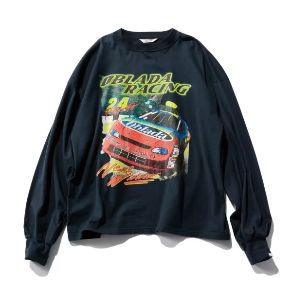 ヴィンテージ服をデザインソースに今っぽくブラッシュアップした、カジュアル服が揃う「オブラダ」。色鮮やかなレーシングプリントがインパクト大のロンTは、一枚で着るもよし、ジャケットのインに合わせるとほどよいアクセントに。バックプリントもクール!
