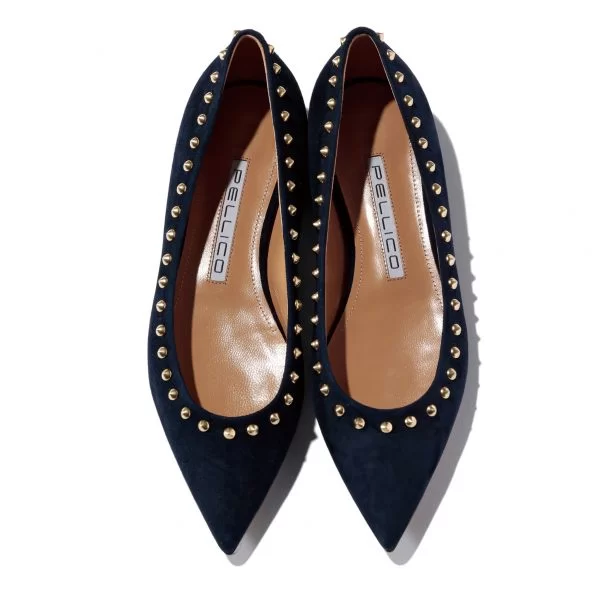 シンプルな中にエレガンスが薫るデザインが得意なイタリアのシューズブランド「ペリーコ」。発色のよいネイビーのスウェード製パンプスは、足をきれいに見せると評判のポインテッドトゥ『アニマ』の木型を使用したもの。ゴールドのスタッズでモダンさをプラス。