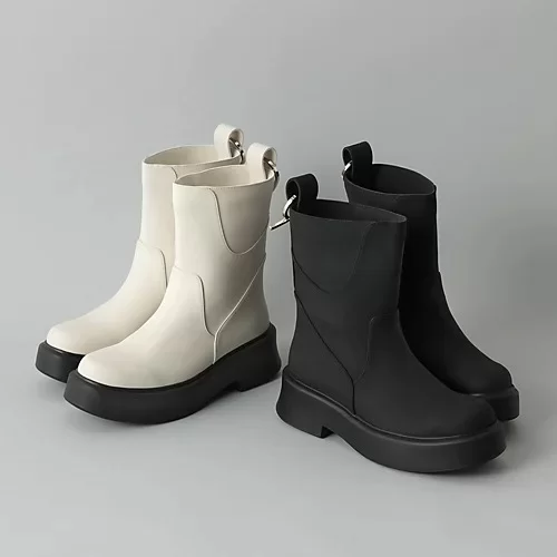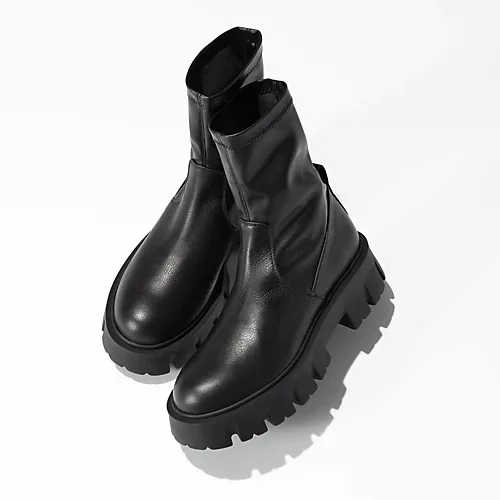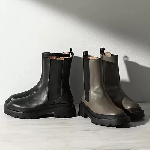 ボリュームのあるソールとやや丈長でほっそりとした履き口のバランスが絶妙なサイドゴアブーツ。内側にファスナーをつけることで脱ぎ履きがスムーズで、足首のホールド感もバッチリ。辛口のデザインは、ふんわりスカートやワンピースの足もととも好相性。