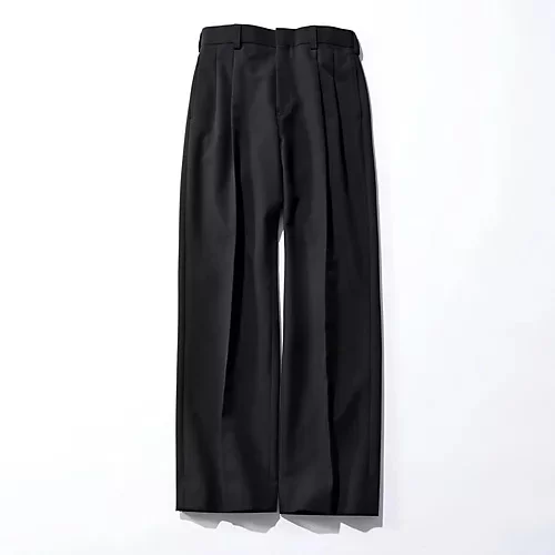タックからセンタープレスへと続く縦のラインと、やや高めに設定したウエスト位置がスラッと脚長に見せると話題のちょい太めの黒。ウエストの一部をゴム仕様にすることで、履き心地もラクちん。肉厚のツイル素材は体のラインが響きにくく、落ち感がきれいで一年中愛用できます。
