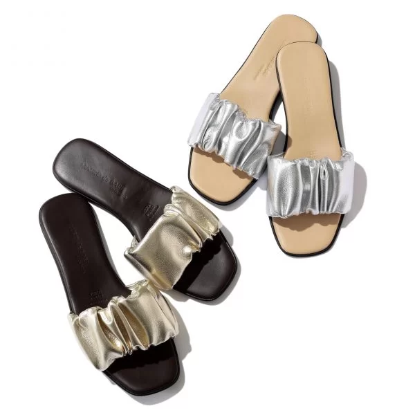くしゅっとギャザーが寄ったチャーミングなデザイン。薄めのソールながらクッション入りで履き心地◎。アッパーレザーの裏側も肌あたりよく仕上げています。メタリックな2色を別注。