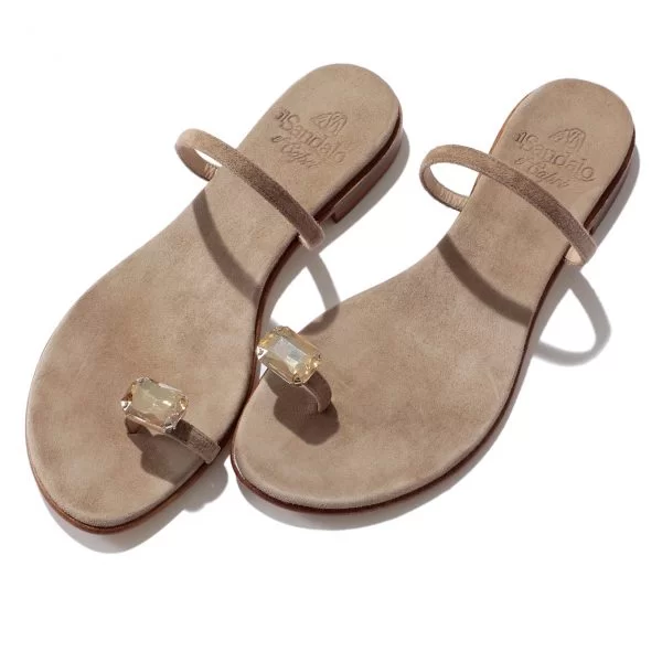 宝石を意味する今シーズンの新作「GENNMA」。ビジュー、アッパー、ソールをベージュで別注して、リュクスだけれど肌なじみのいい表情に仕上げました。華奢なストラップもを女らしい足もとを演出します。