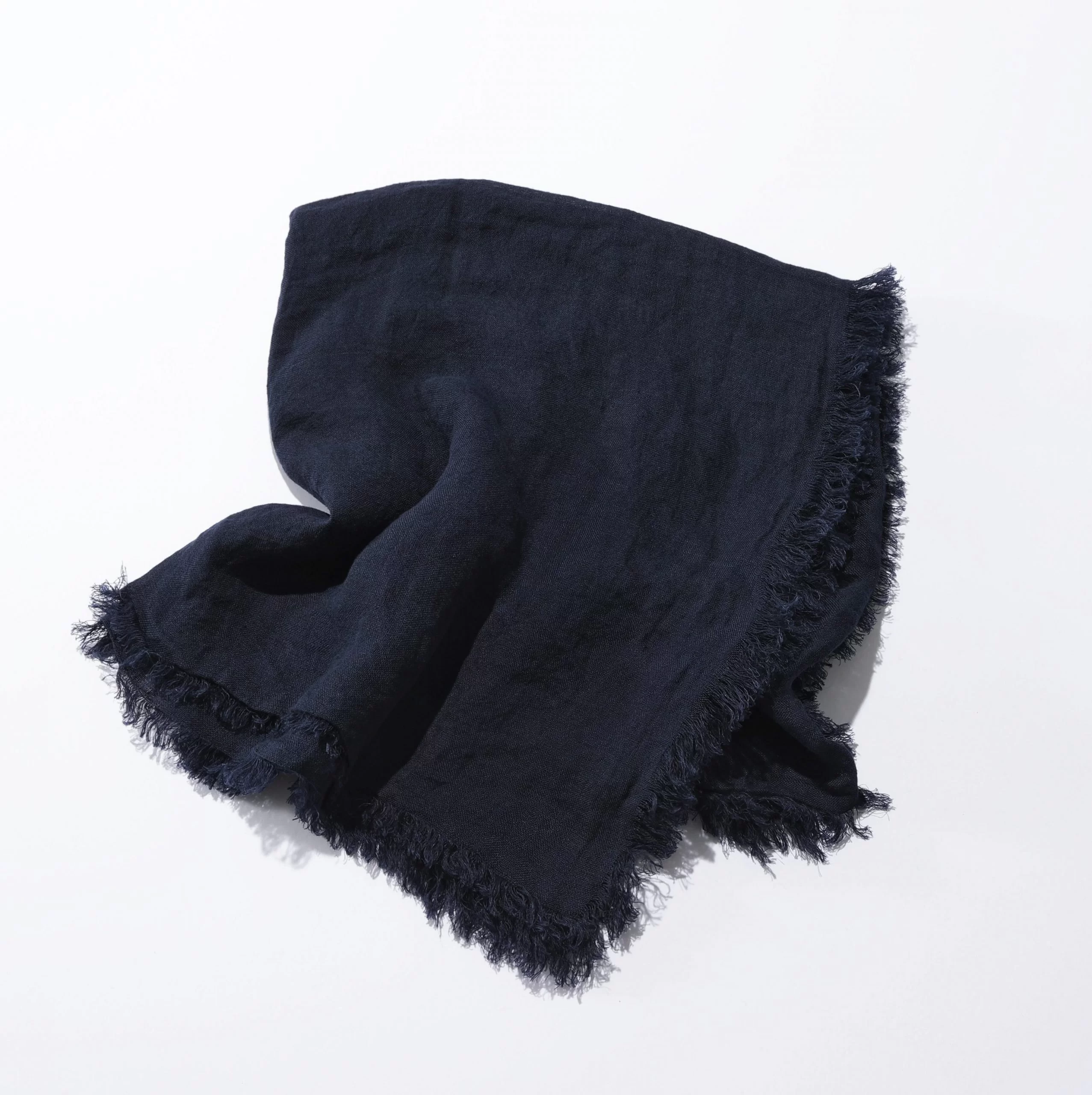 粗めのざっくりとしたリネンの風合いが、夏らしいナチュラルなムード。フランダース産の高級リネンはソフトな肌触りが特徴で、まるでガーゼをまとっているような心地よさに感動します。長くて幅も広いので、夏の冷房対策にもお役立ち。色は何にでも合う便利なネイビーがおすすめ。