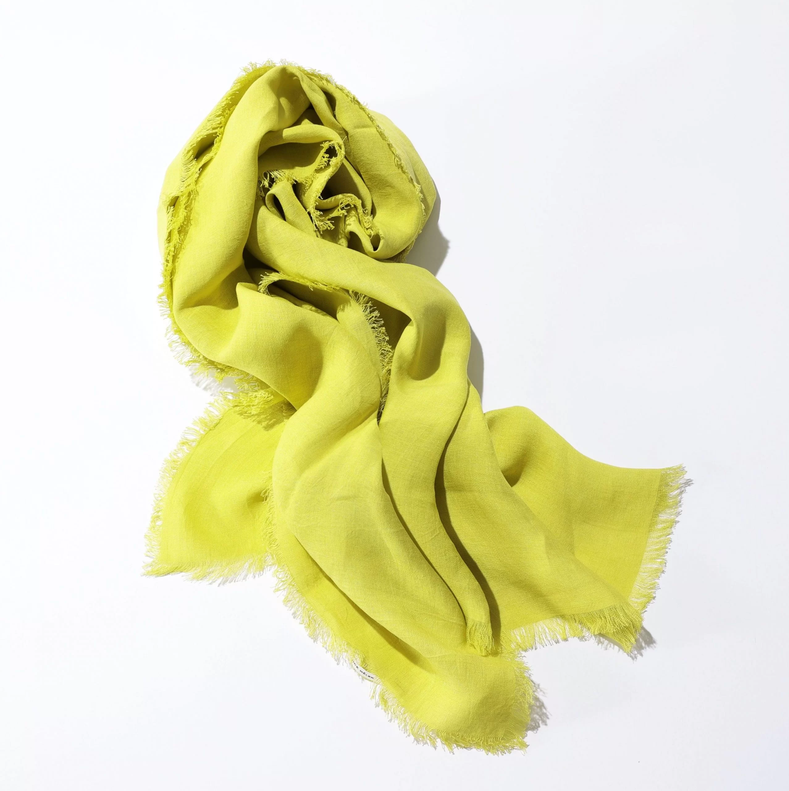 色鮮やかなイエローが夏スタイルのスパイスになるリネンストール。リネンならではのドライ感がありながら、チクチクしない肌触りの良さを追求した逸品です。オーガニック原料を使っているので、美しい光沢感があるのも特徴。大判でありながらボリュームが出すぎず、しっとりしなやかな使い心地。