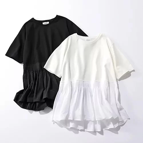 シンプルなTシャツでは物足りない、そんな大人に向けたTシャツとブラウスがドッキングした着映えTシャツが完成。二の腕がしっかり隠れる袖丈にゆったり身幅、体型カバーも兼ねたふんわりペプラムは、袖を通すだけで着こなしが決まります。色違いで揃えてヘビロテさせて。