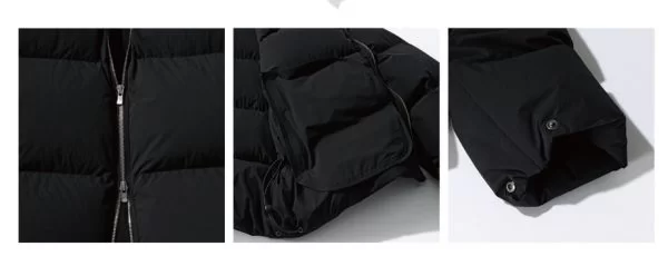 (左)上品なシルバーニッケルのファスナーは着こなしの幅が広がるWジップ仕様。(中)ややマットなテクスチャーのナイロン素材なのでダウンでもスポーティすぎず、きれいめな印象に。(右)袖口はスナップボタン付きで真冬でも安心。