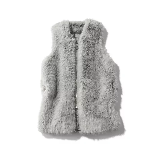 インナー部分がMA-1風デザインになったファーベスト。インナー部分をグレーにカラー別注することで、きれいめスタイルにも合わせやすく。着膨れしないサイズ感にもこだわりました。リアル見えするエコファーは軽やかで普段使いしやすい。両サイドにポケット付き。
