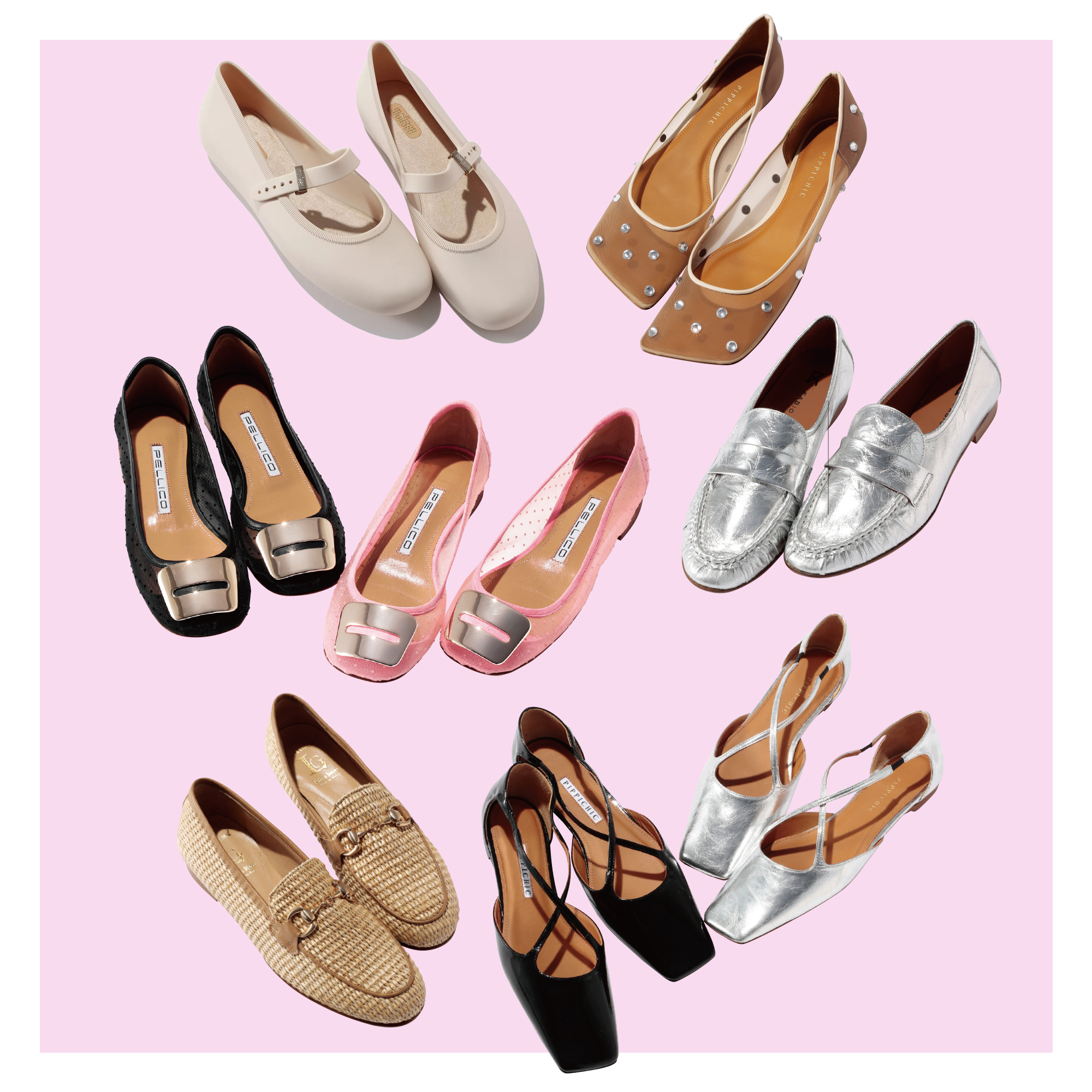 バレエのトゥシューズを彷彿させる華奢なクロスデザインのフラットシューズは、トゥ先がシャープなスクエア型なので、足元を細くすっきりと見せてくれる頼もしい一ツヤツヤのパテントブラックとメタリックシルバー、どちらもシーンを問わずに活躍。ヘルシーな肌見せでぺたんこながらセンシュアルな印象に。