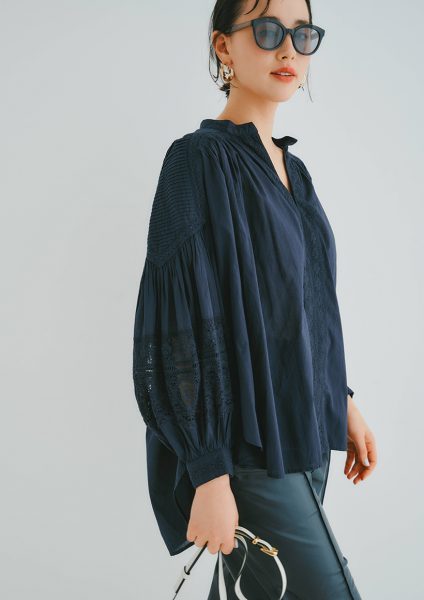 ふんわりシルエットとボリューム袖が女性らしく、袖のレースの透け感やキーネックの襟元が涼やかな印象を添えて。デニムをはじめ、どんなボトムとも相性抜群ですが、ブラウスのシックなネイビーを生かして、こんなレザー調パンツと合わせてみたら、着こなしがぐっと洗練されて大人っぽい表情に早変わり。