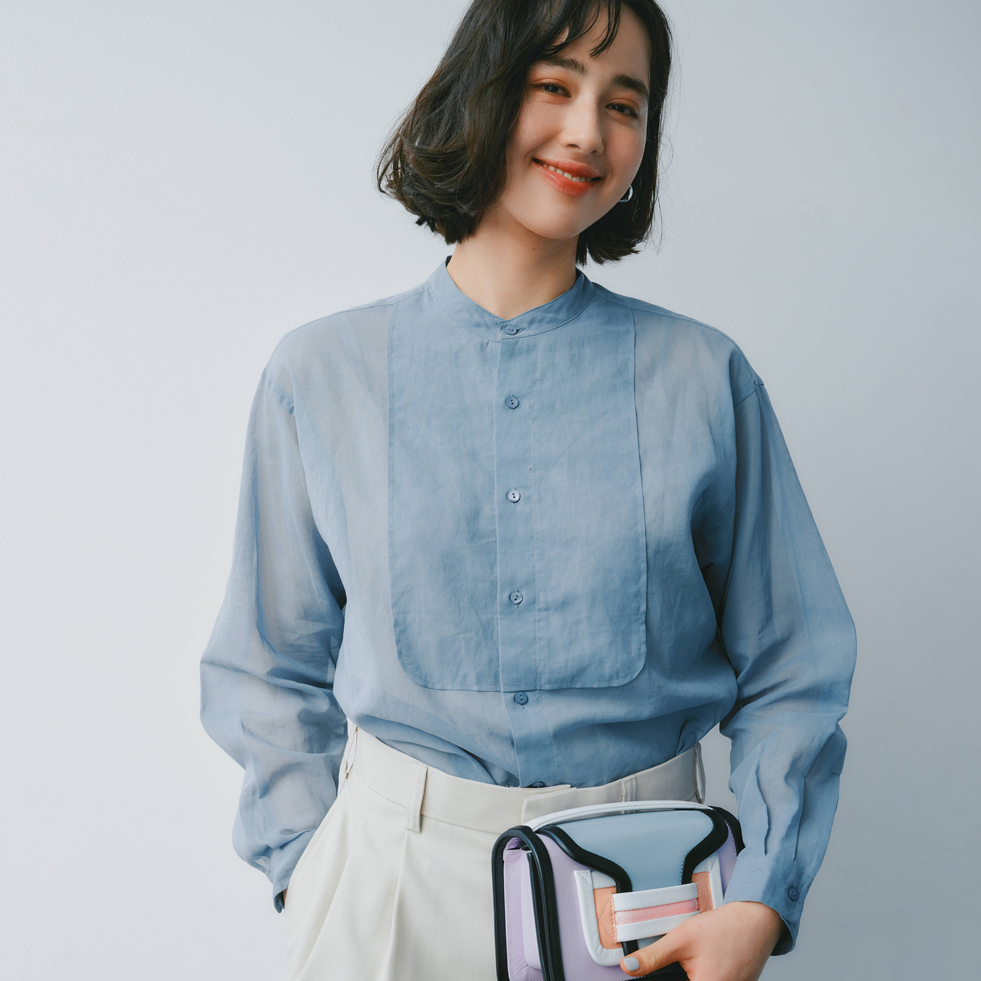 クラシカルなバンドカラーにブルーグレーがシックなブザムシャツは光沢を抑えたコットンボイル製。生地にほのかな透け感があるので、着るとほどよい女らしさが出て、クラス感さえ漂います。そこはかとなくドレスアップ感のあるデザインなので、ジャケットのインなどにも使えます!