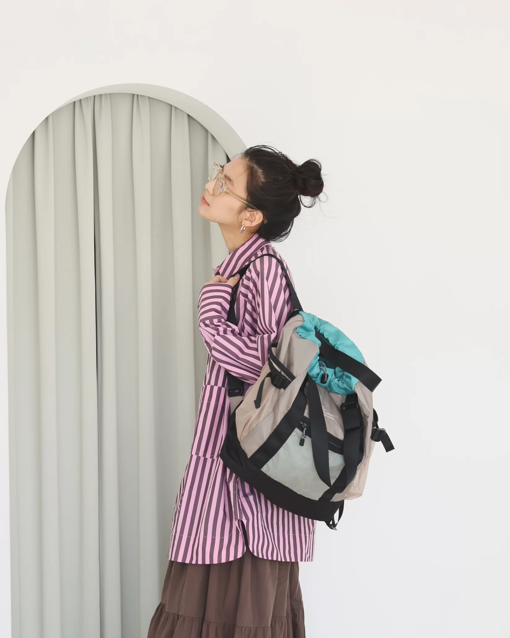 グレージュ×ブラックに、ターコイズブルーのトップやボルドーのファスナーをきかせた別注モデルは、レトロアウトドアな色使いがカジュアル服からきれいめ服までなじみよし。ブランドロゴは通常タグを縫い付けるところ、同色の刺繍で別注して控えめに仕上げました。素材は軽くてマットなリップストップナイロンで、シャカシャカ音もしないので落ち着いた印象。全体的にいかにもなアウトドア感を薄めているため、職場によっては通勤バッグとしても活躍するほど大人度高めです。