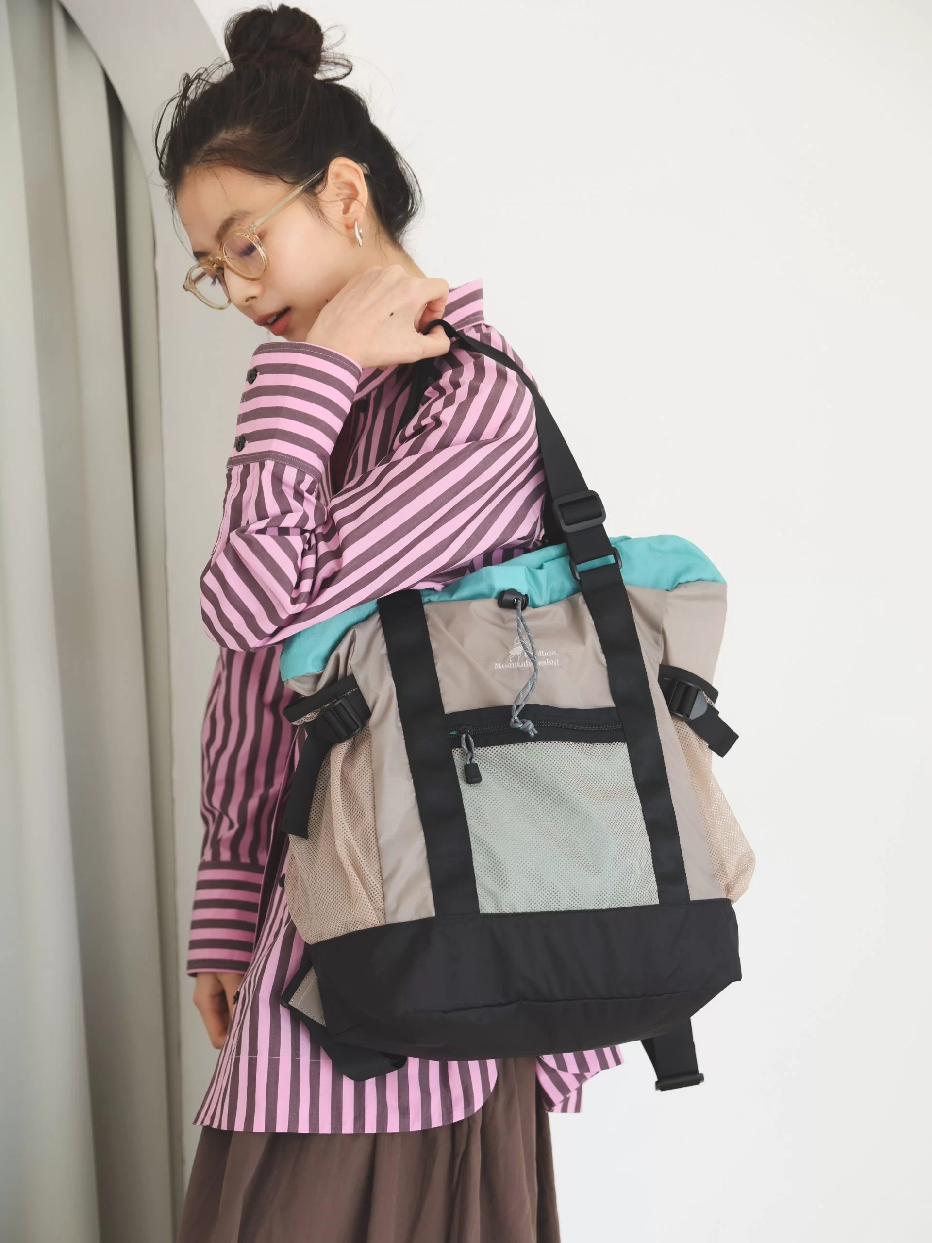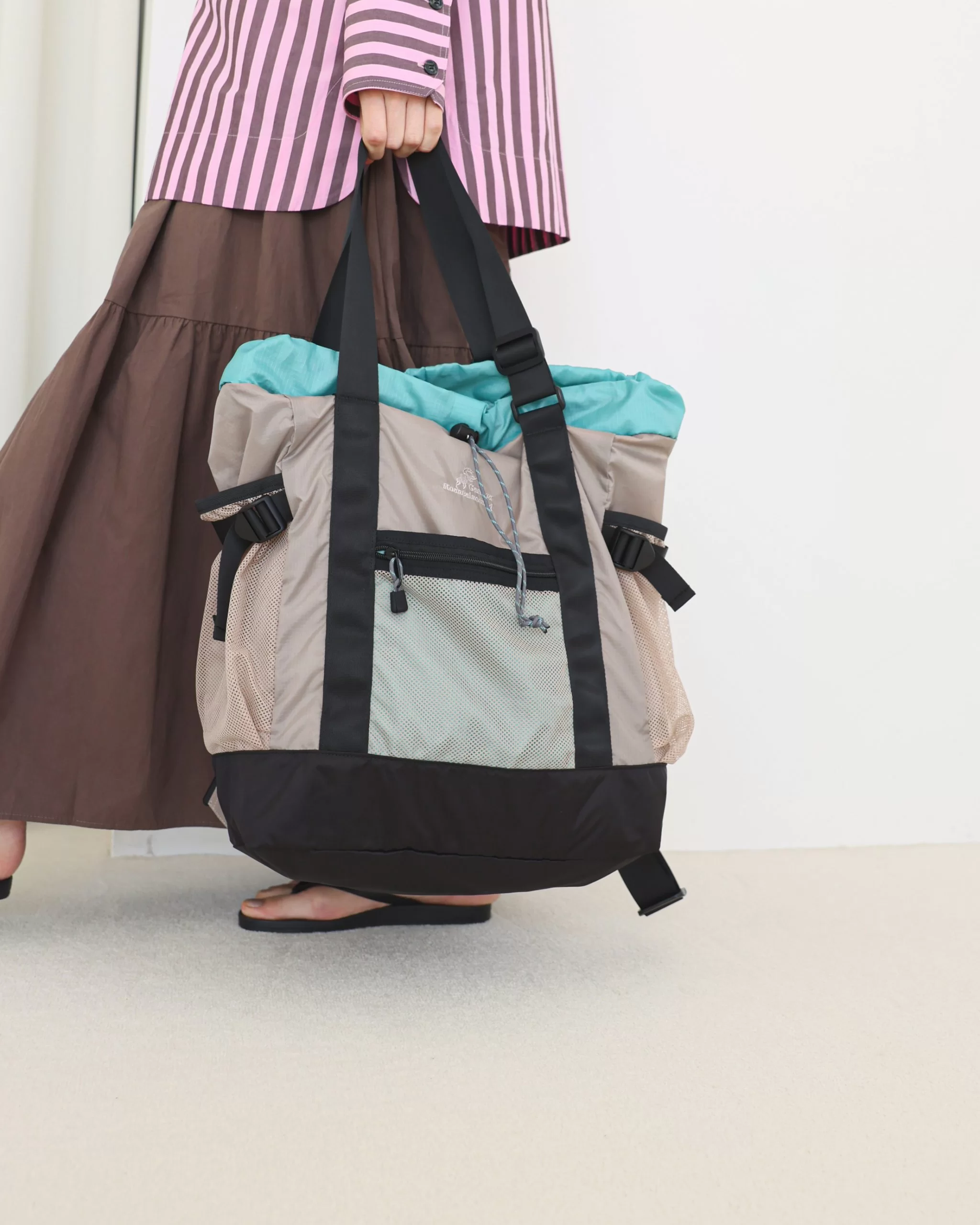 バッグの持ち方を変えるだけで、印象も使い勝手もがらりと変化。通勤や街歩きではトートですっきりと。大荷物や自転車の日はバックパックで快適に。旅先では移動中は背負って、ホテルに着いたら手提げにすれば、チェックインもスマートです。大きく開く口は出し入れしやすく、ポケットも充実。パソコンやペットボトルなどを収納してもなお余裕があるので、帰りがけにスーパーで買い物してもラクラク収まります。大荷物になっても巾着でキュッと口を絞ればしっかりガードできて安心。こんなふうに頼りがいのあるところは、アウトドアブランドならではです。