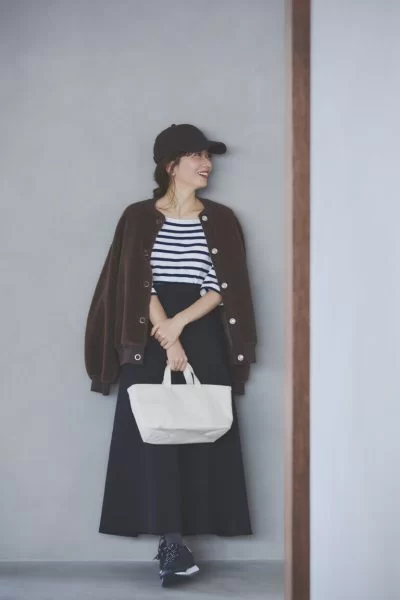 前編から長らくご紹介させていただきましたが、今回のコラボアイテムは以上です。可愛さも、心地よさも、バランスよく見えることにもとことんこだわりましたが、基本はシンプルなので、どう組み合わせても決まりやすいのもポイント。ブルゾンにボーダーもいいし、スカートにバレエ靴もいいし、その全部をこんなふうに組み合わせたってOK。もちろん手持ちの服に加えても楽しく着ていただけるものばかりですので、ぜひお好きなアレンジで一緒におしゃれを楽しみましょう!