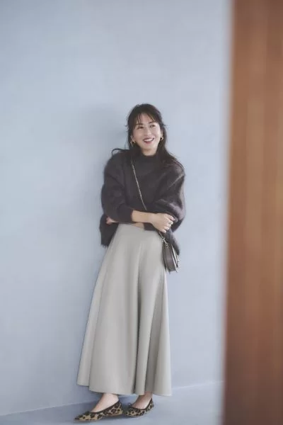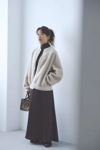 「まるで羊のようにやさしい色合いのエクリュは、明るさがあるぶん顔映りもよく、アウターとしてうってつけの色。服のトーンが暗くなりがちな秋冬だからこそ、こんな淡いニュアンスカラーがいい抜け感にもなります」