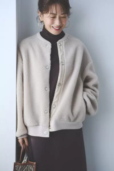 「まるで羊のようにやさしい色合いのエクリュは、明るさがあるぶん顔映りもよく、アウターとしてうってつけの色。服のトーンが暗くなりがちな秋冬だからこそ、こんな淡いニュアンスカラーがいい抜け感にもなります」