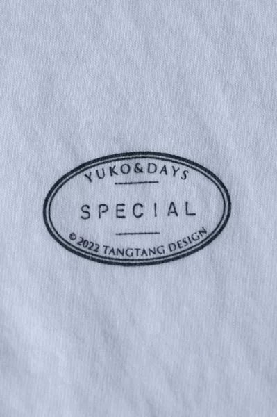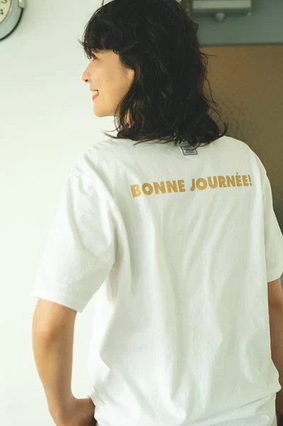 五明さんが厳選したワードを、前後に異なる言語であしらい、タンタンらしさが光るフォントと計算された配置で、インパクトのあるデザインに。白地に昼間をイメージしたベージュのロゴが、さりげないおしゃれセンスを感じさせます。素材は生地の状態で洗いをかけた風合いのある、やや肉厚で柔らかなコットン100%。サイズはゆとりのあるユニセックスのM。
