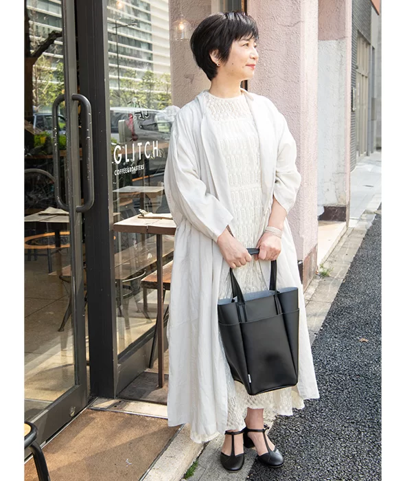昨夏掲載時に大人気だったプランテーションのボストンバッグ。今回も後藤さんのこだわりがふんだんに詰まった新デザインのバッグが登場しました。白いレースのワンピースに、プランテーション×後藤さんコラボのカシュクール型ワンピースをレイヤード。「バランスよく持てる!」と大評判の縦長トートとTストラップシューズを黒で合わせ、軽やかなワントーンコーデのスパイスに。