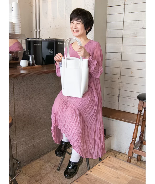 気持ちも顔映りも引き上げるピンクに、クリーンな白いバッグが好相性です。’ワンピース班長’の異名を持つ後藤さんお気に入りの1着は、以前LEEマルシェで購入したもの。ダンスコのパテントシューズは、「年間を通してほぼ毎日はいています。さすがにくたびれてきたので、最近2代目を購入したほど(笑)」。