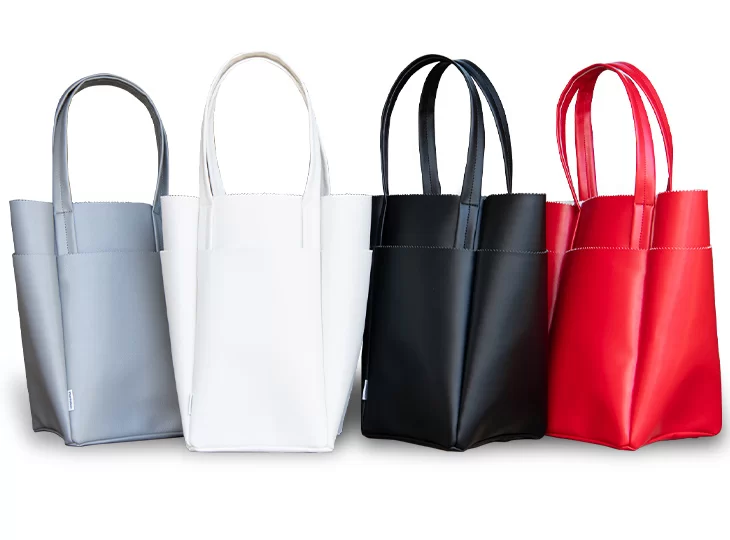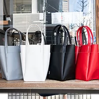 数年前から愛用していたブランドの定番トートに、後藤さんのこだわりをたっぷり盛り込んで誕生した新モデル。毎日の着こなしにすんなりなじむ小さめのボディや、外側に4つ+内側に2つのポケットといったコラボポイントをはじめ、軽量で扱いやすいフェイクレザー素材、手持ちも肩がけも好バランスなハンドルなど、使い勝手のよさは言うことなし。「コンパクトだけど深さがあるので荷物をたくさん収納できるし、底が四角いからお弁当もすっぽり入ります。水に強いので雨の日も安心!」。ベーシックな黒、白、グレーに、後藤さんが次に狙う赤を加えた全4色展開。